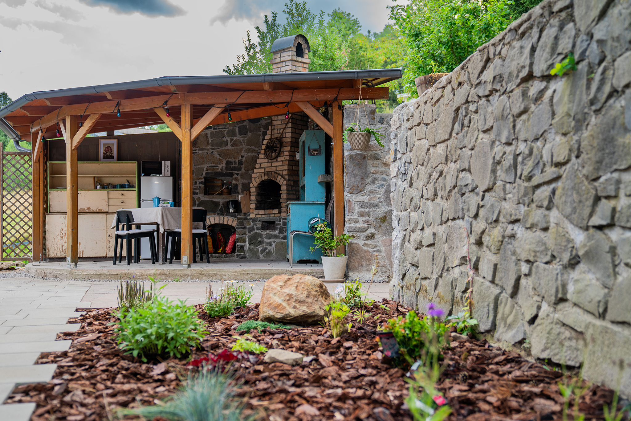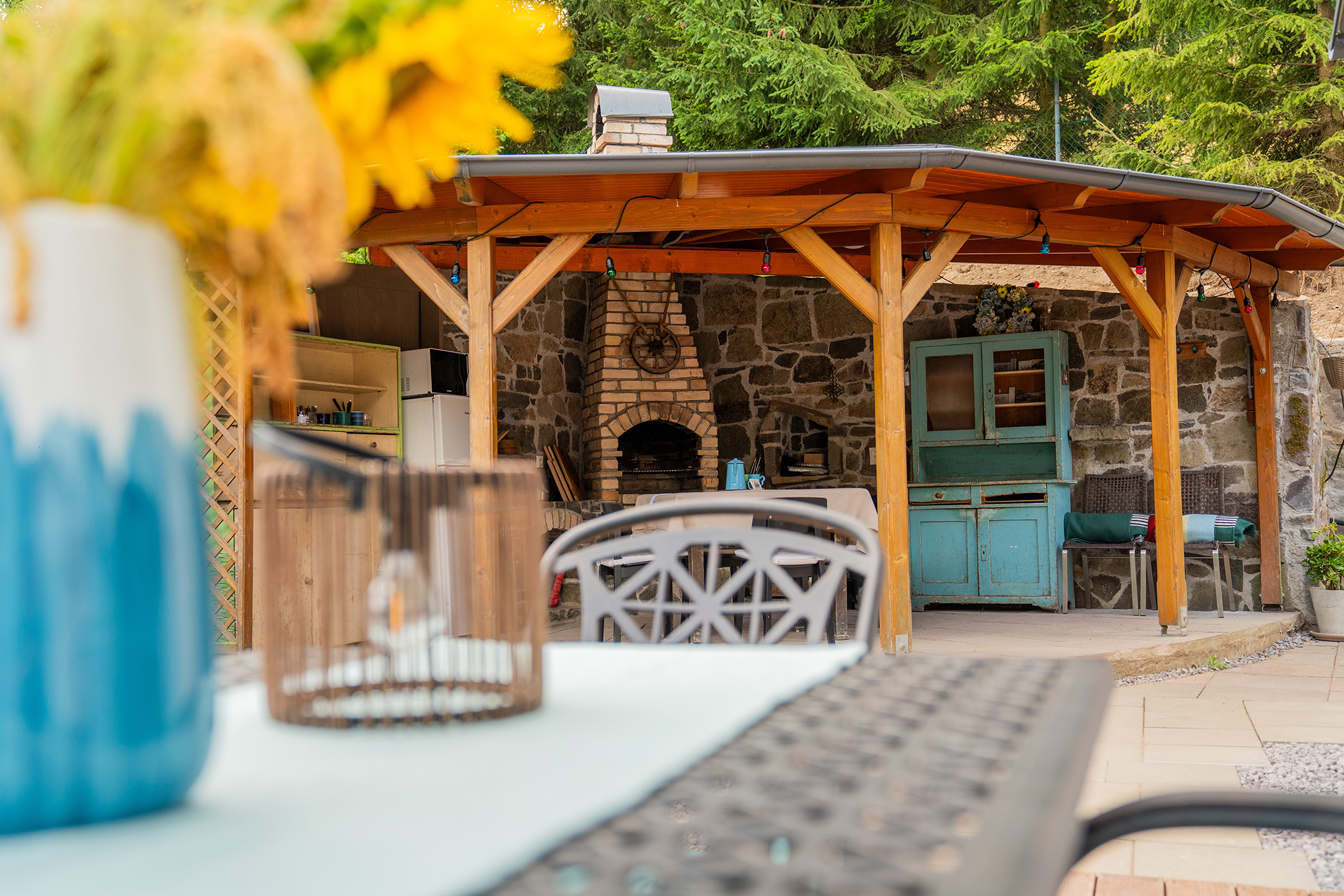 K dispozícii je aj altánok so sedením a priestorom na grilovanie, je tu murovaná vonkajšia pec na opekanie.