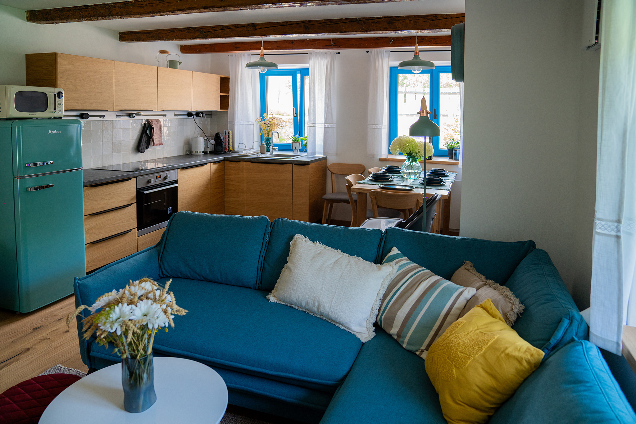 Nachádza sa tu plne vybavená kuchyňa, jedálenský stôl a obývačka s historoickou murovanou funkčnou pecou. V obývačke je rozťahovací gauč.