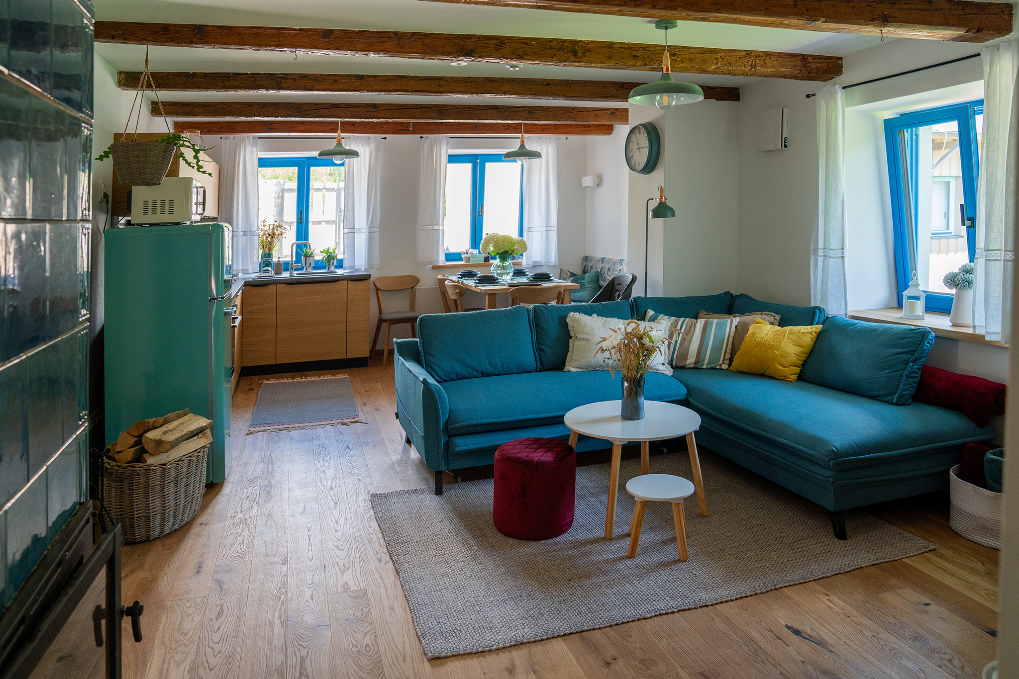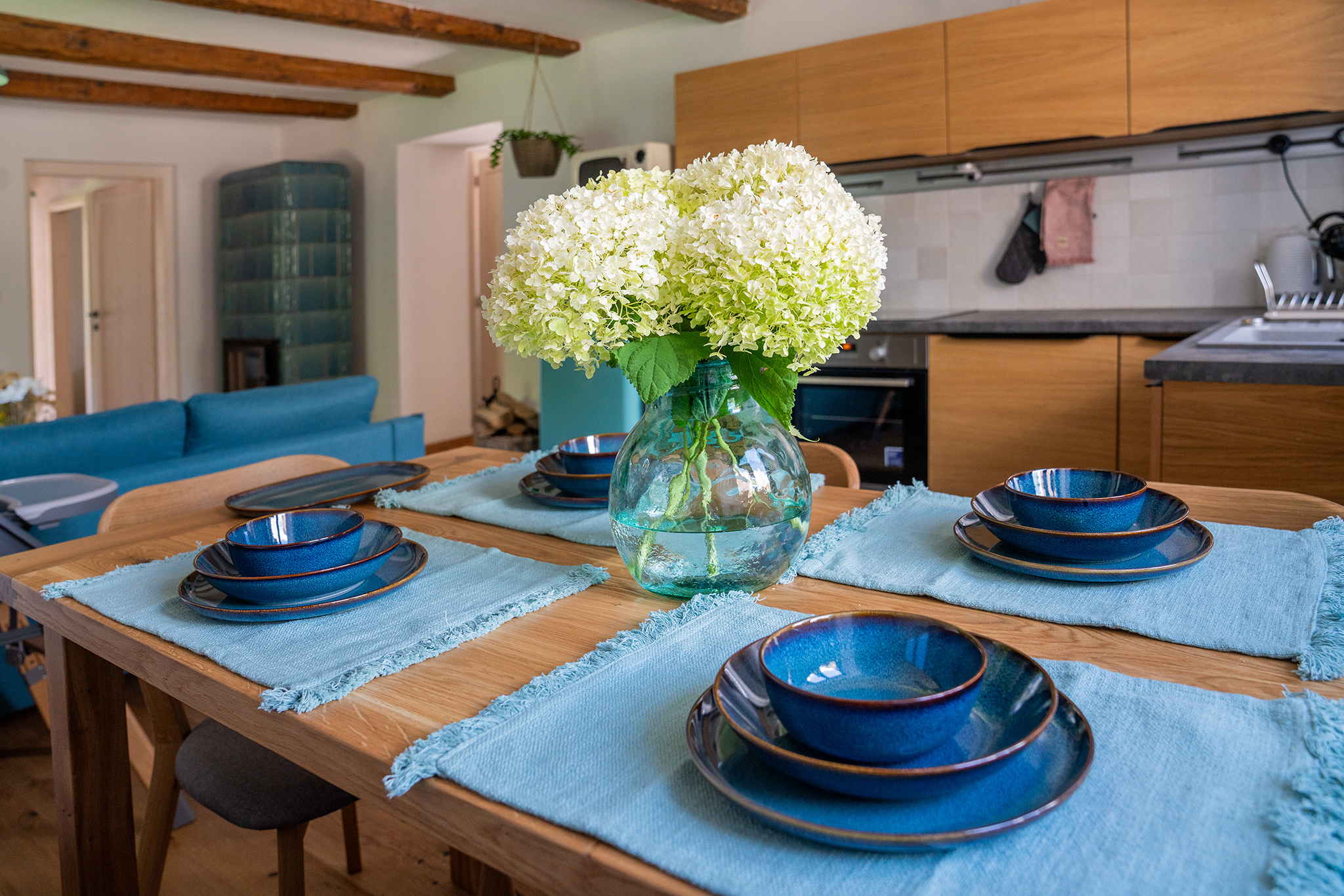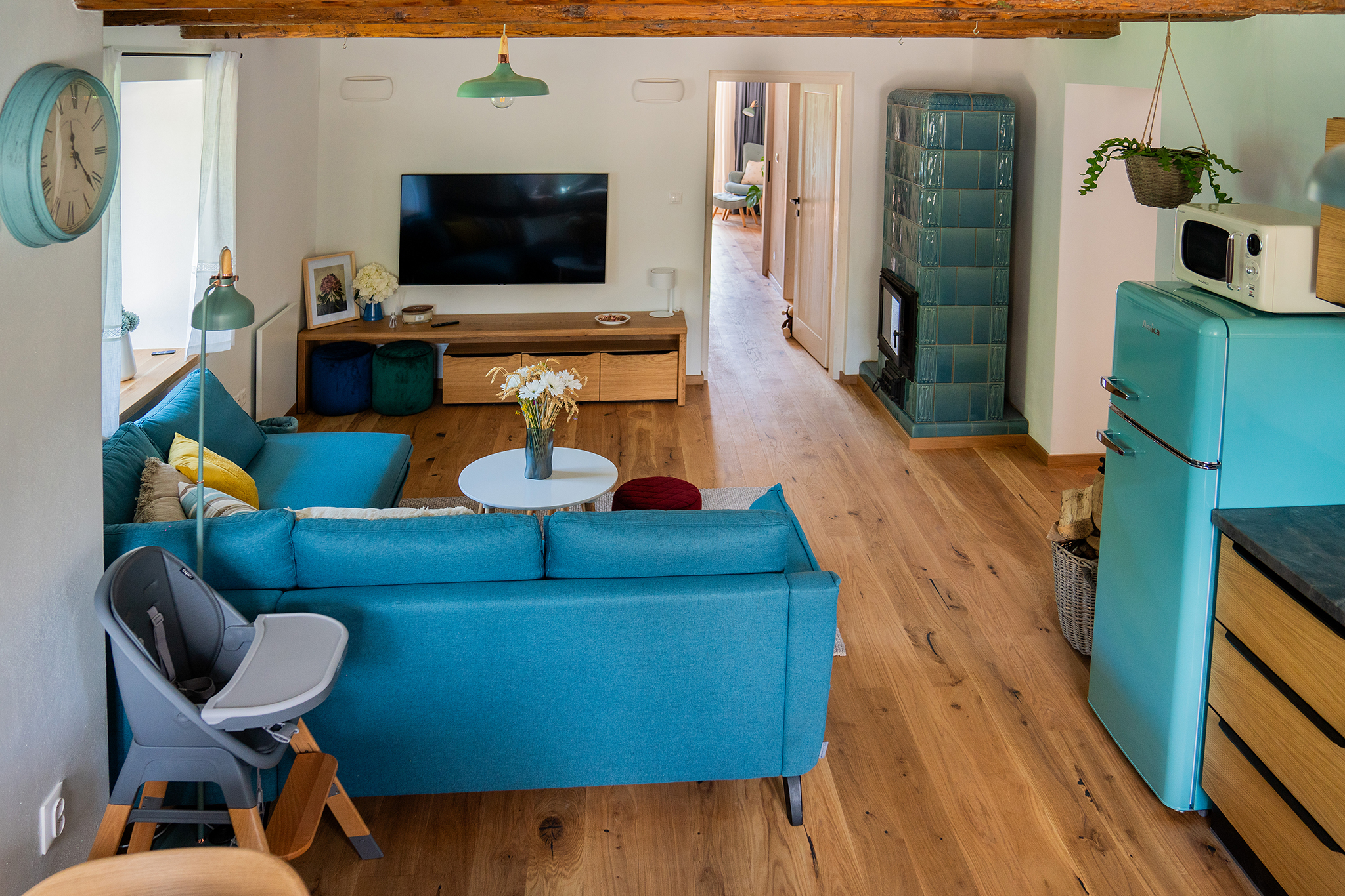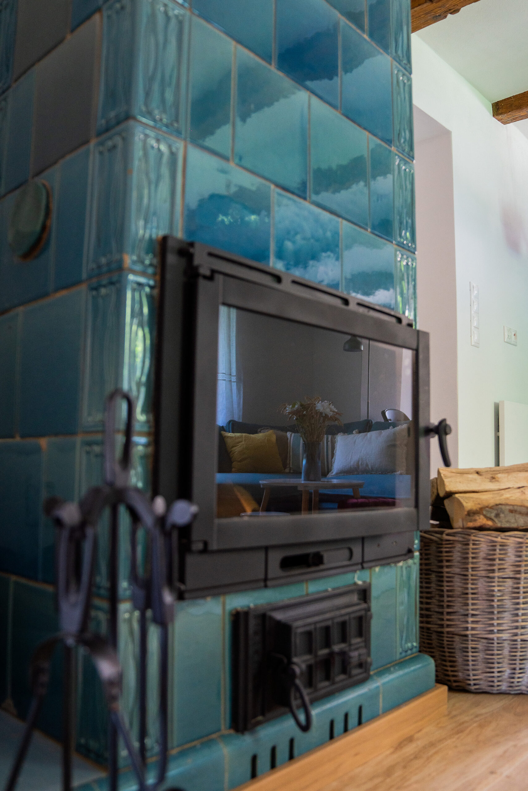 Komfort je zabezpečený modernými technológiami, vzhľad a pocit je vidiecky, vrátane pece na drevo s veľkým sklom na pozorovanie ohňa.