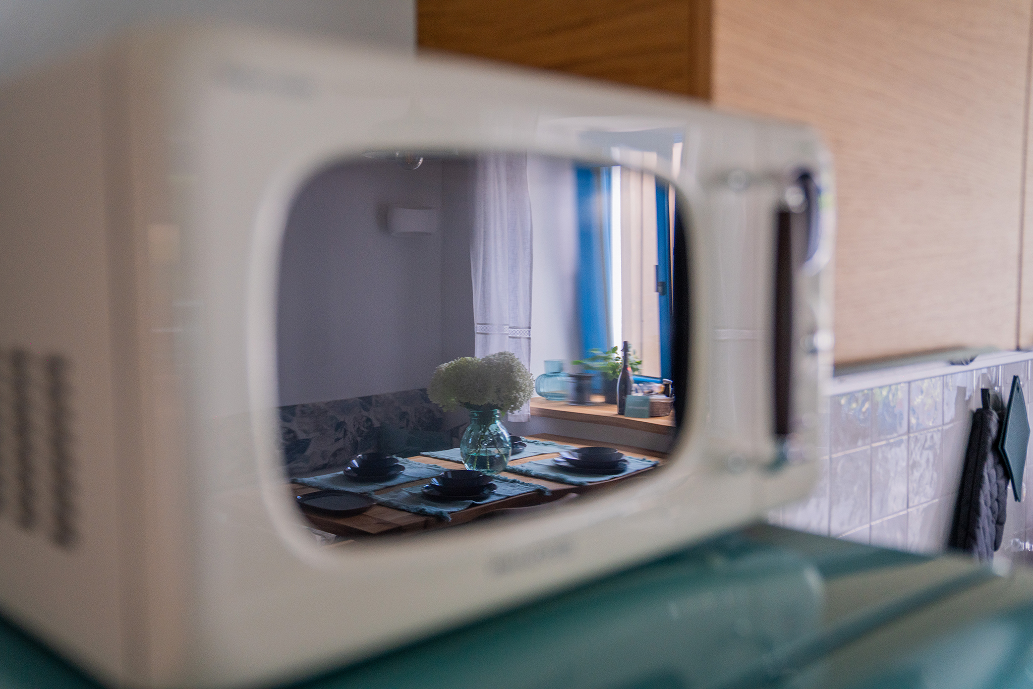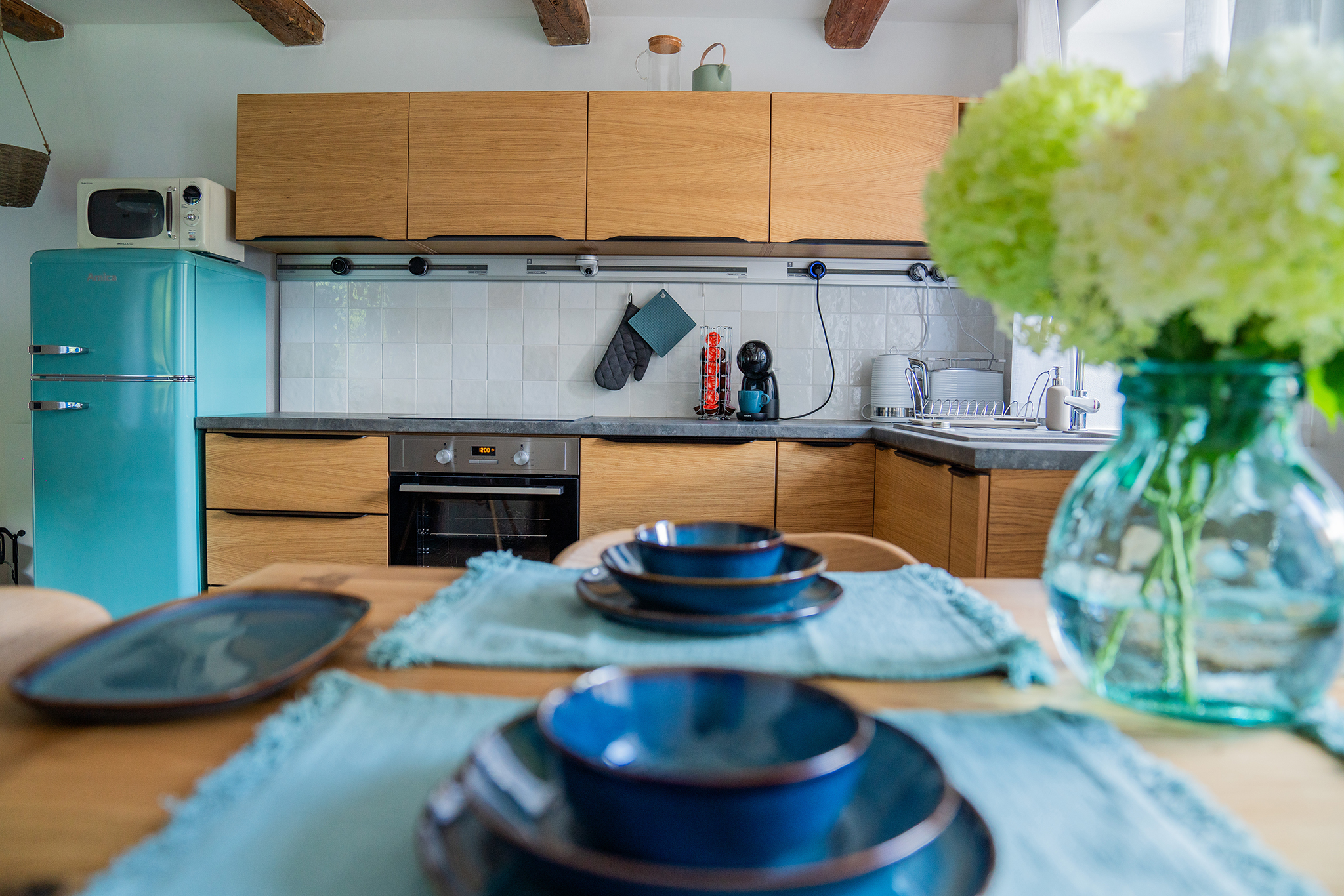 V kuchyni je chladnička, varná doska, rúra na pečenie, mikrovlnka, kávovar na kapsule a rýchlovarná kanvica. Je plne vybavená riadom a kuchynským náradím, aj hrncami a panvicami.