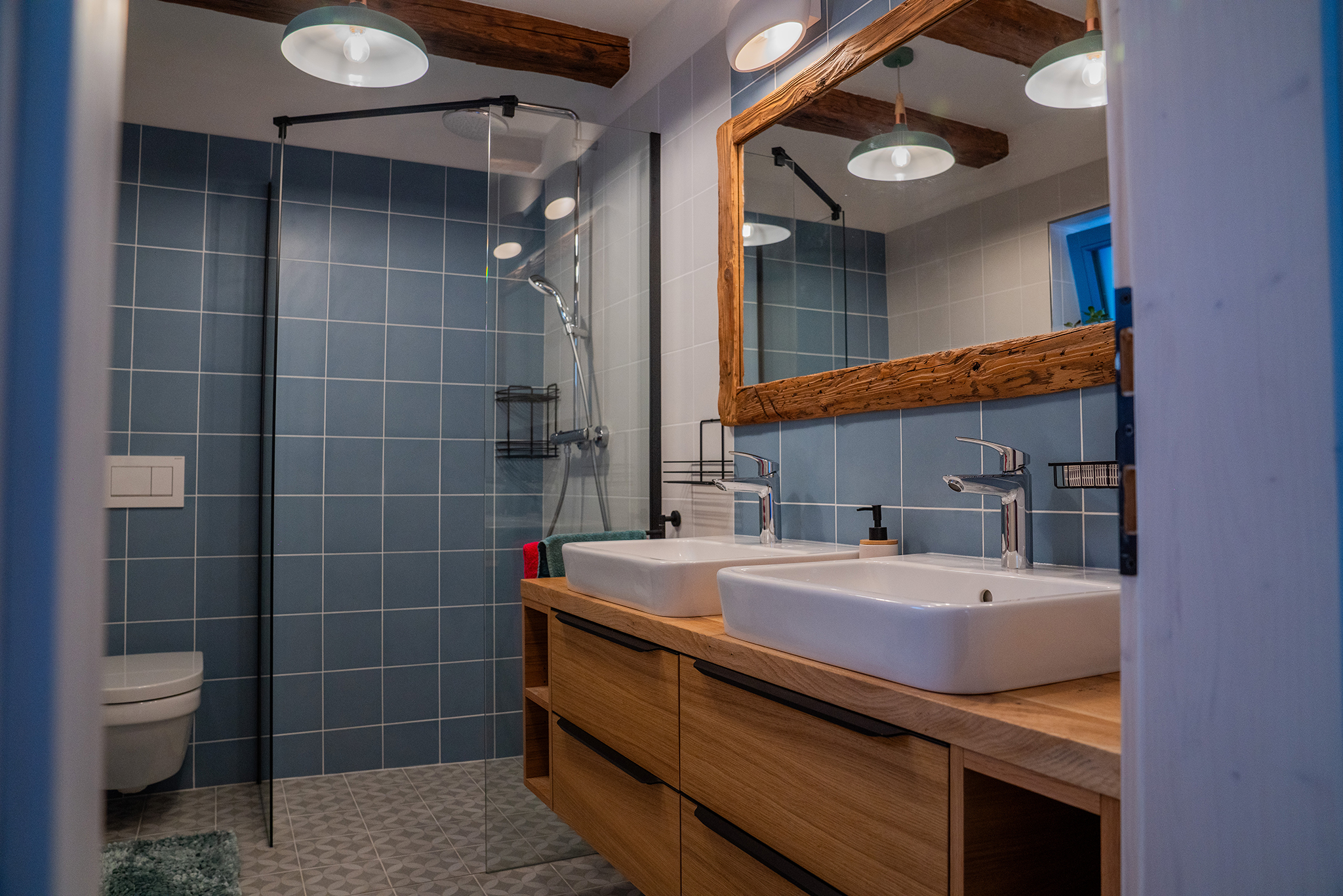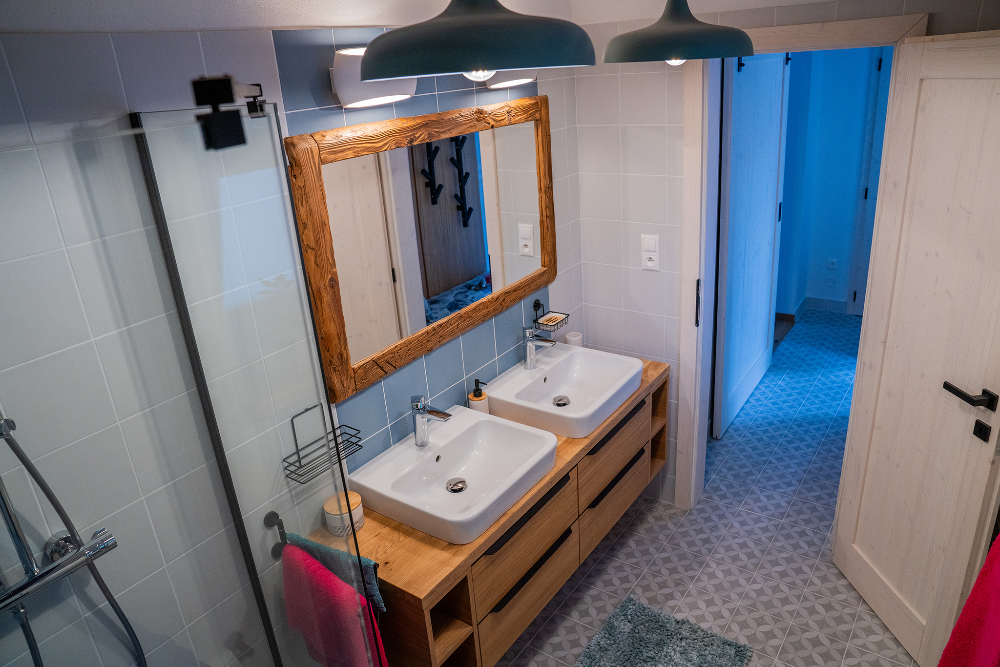 V kúpeľni je toaleta, umývadlo so skrinkou a miestom na odkladanie drobností a sprchovací kút oddelený sklenenou stenou. Samozrejmosťou je základné vybavenie, ako toaletný papier, tekuté mydlo, čistiace prostriedky do WC aj kuchyne, hubky na riad, utierky, uteráky, aj posteľné prádlo.
