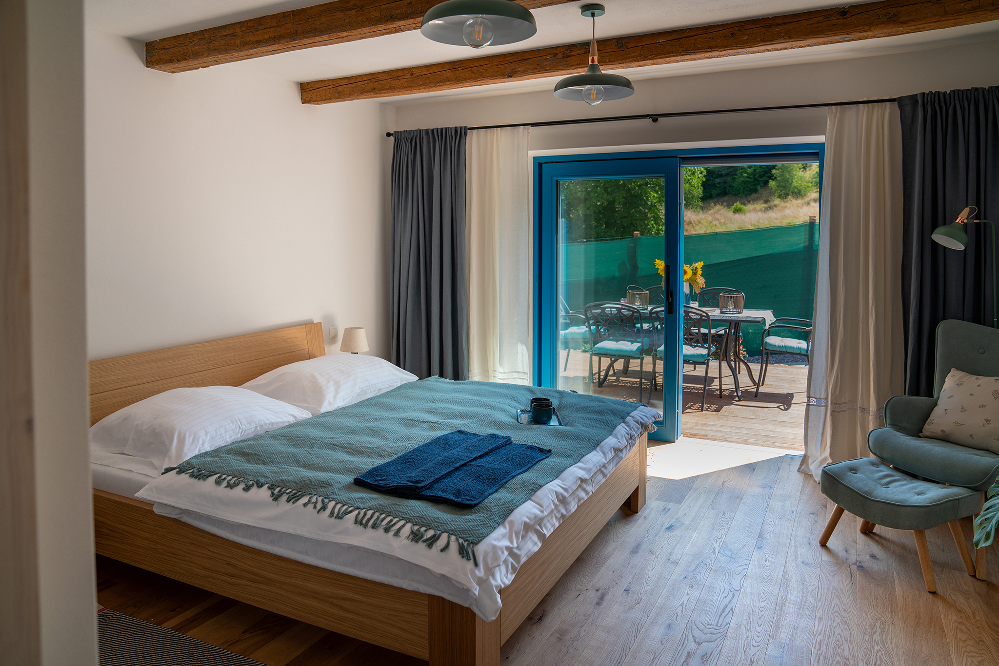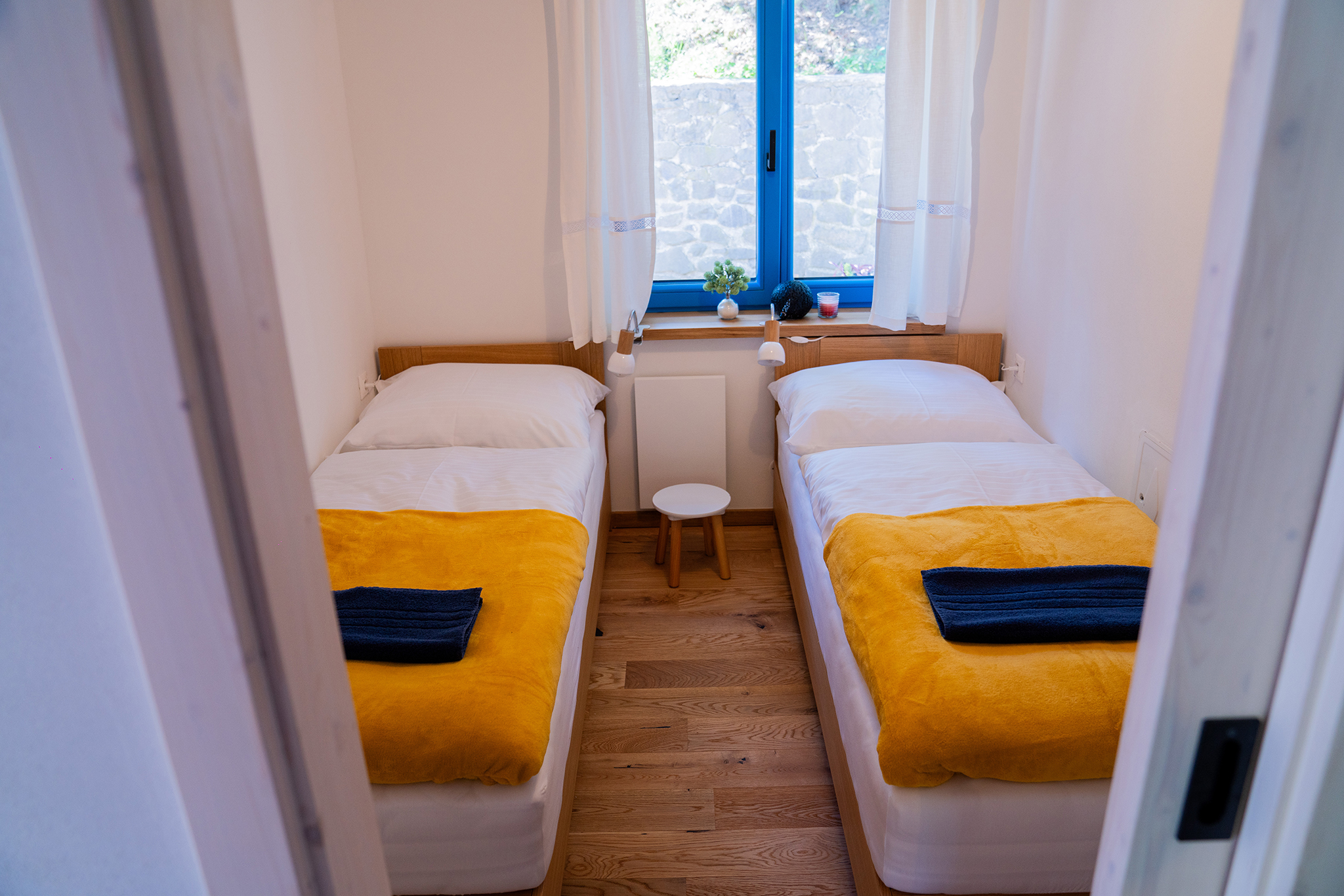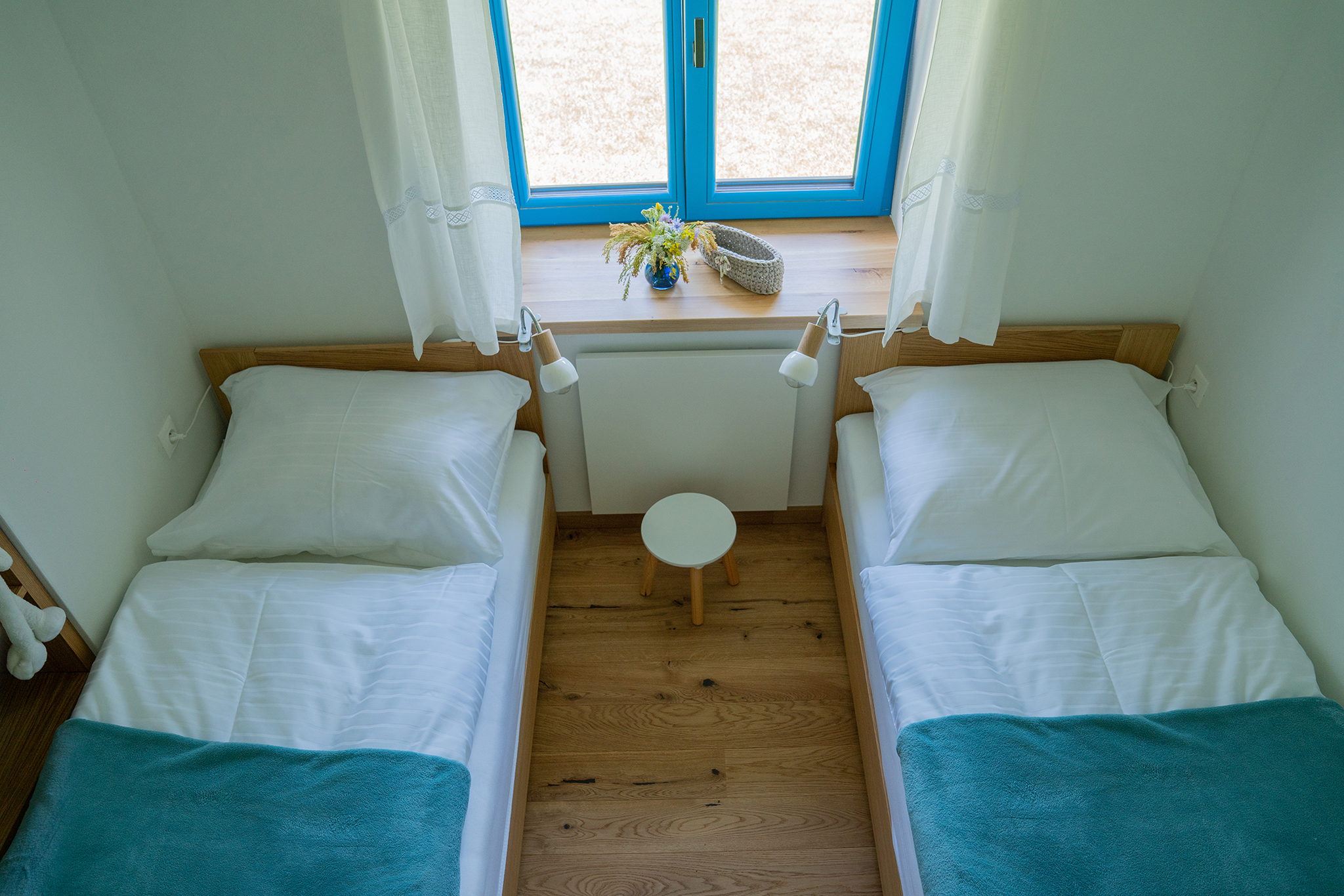 Nachádzajú sa tu dve izby s dvomi jednolôžkovými posteľami a veľká spálňa s manželskou posteľou s prístupom na vonkajšiu terasu. V obývacej časti nájdete rozkladaciu pohovku a v spálni je aj detská postieľka.