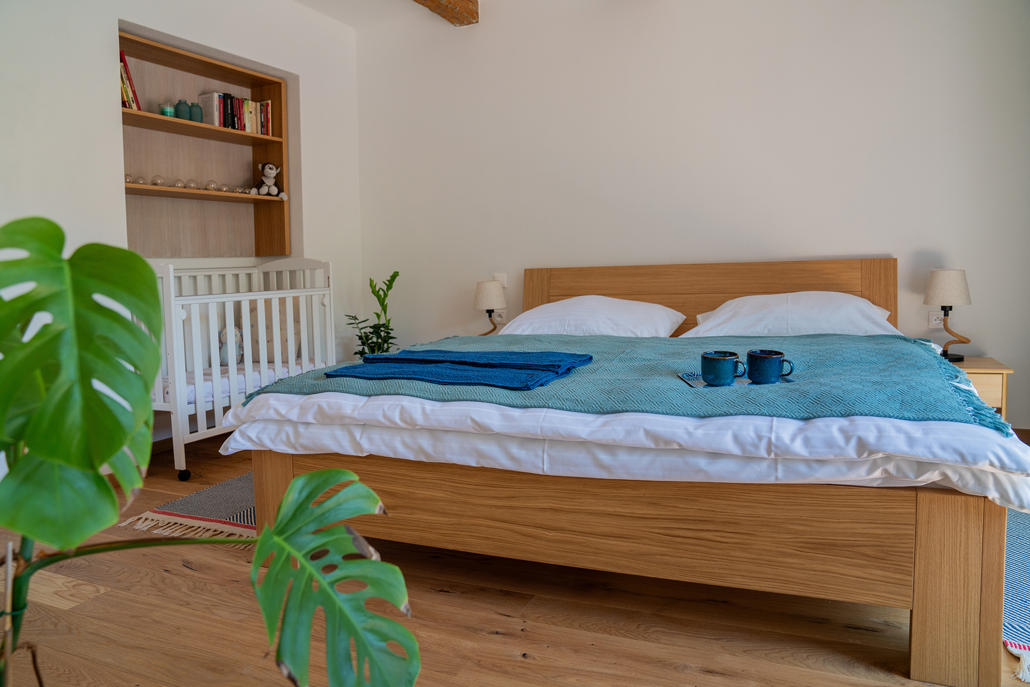 Mysleli sme aj na tých najmenších, v spálni s manželskou posteľou sme umiestnili detskú postieľku a nájdete tu aj milý detský kútik s knihami a hračkami.