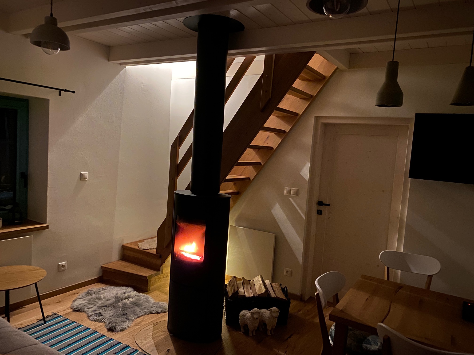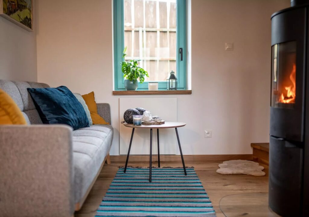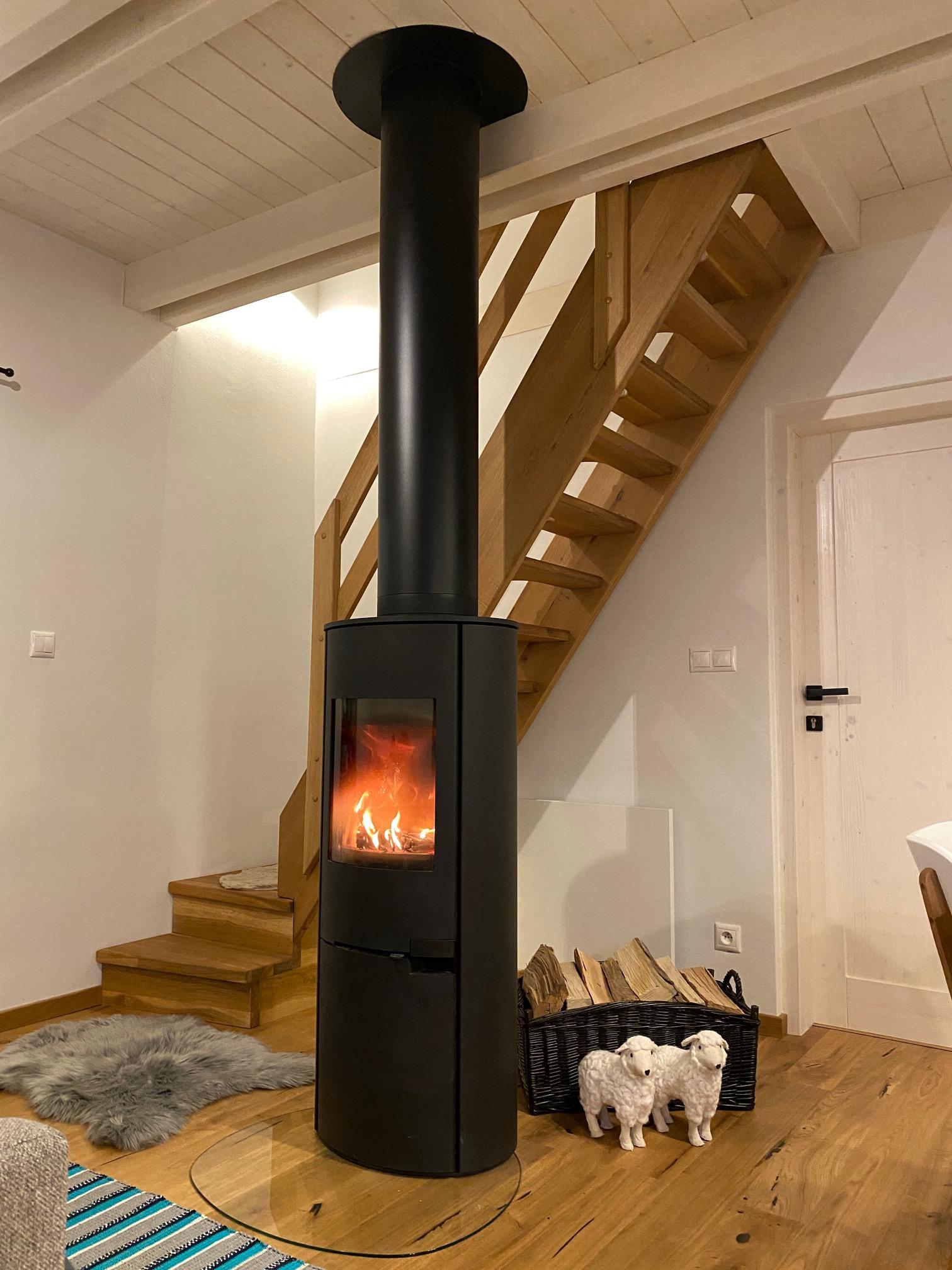 Komfort je zabezpečený modernými technológiami, vzhľad a pocit je vidiecky, vrátane piecky na drevo s veľkým sklom na pozorovanie ohňa.