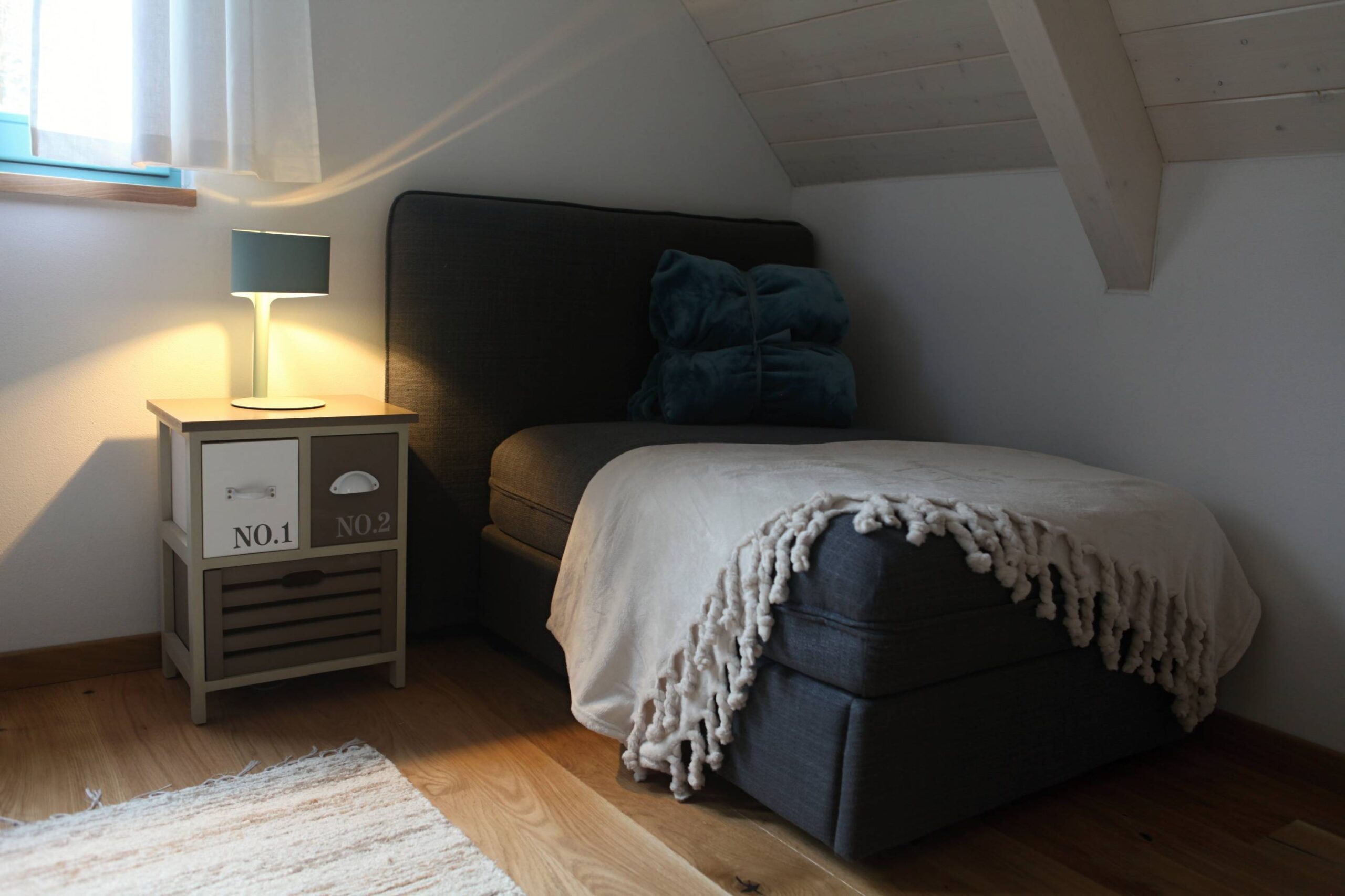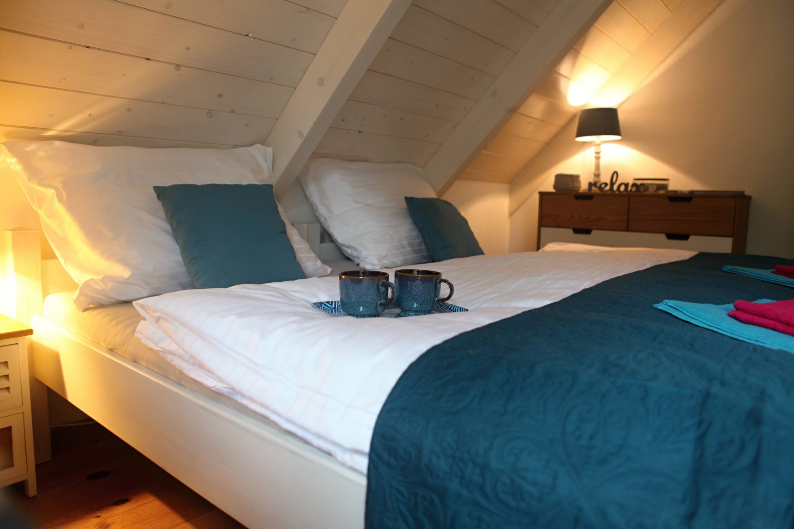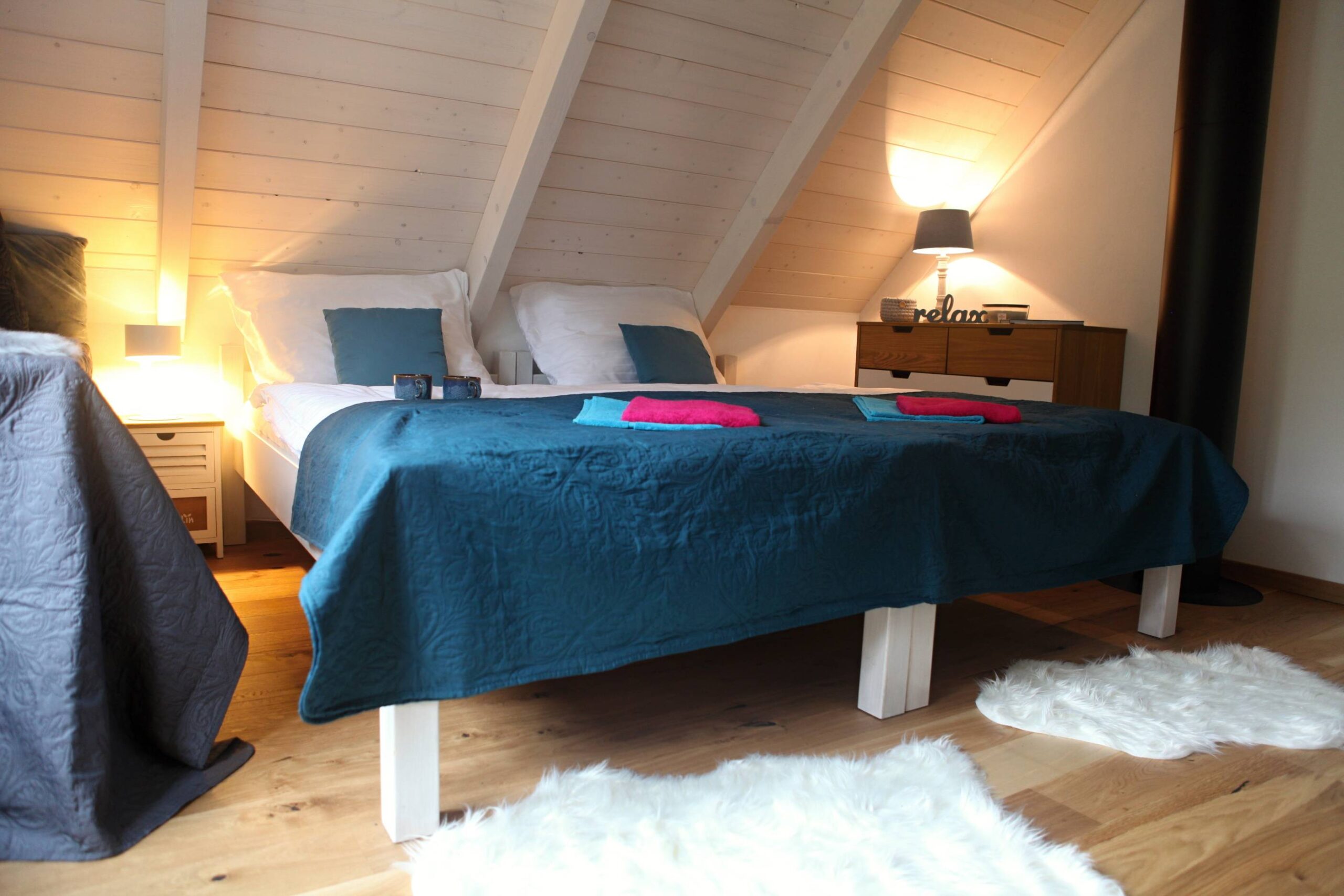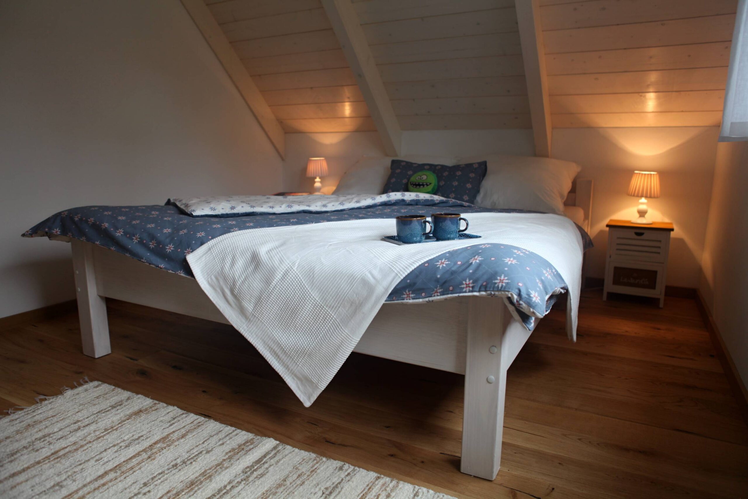 Na poschodie sa dostanete tzv. mlynárskými schodmi. Vo väčšej spálni vpravo sú dve samostatné postele, ktoré sa dajú spojiť, rozkladacie kreslo, komoda, nočné stolíky.