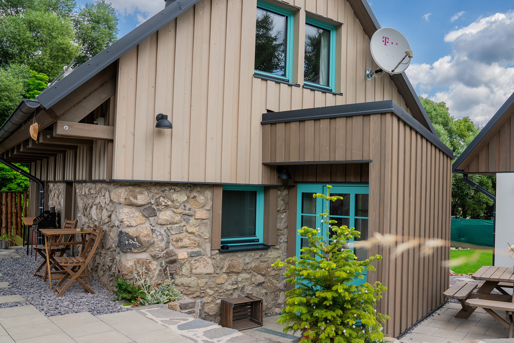 V teplejšom počasí sa môžete potešiť malým sedením pred vstupom do chalúpky. K dispozícii je aj altánok so sedením a priestorom na grilovanie, vonkajšia pec na opekanie a detské ihrisko.